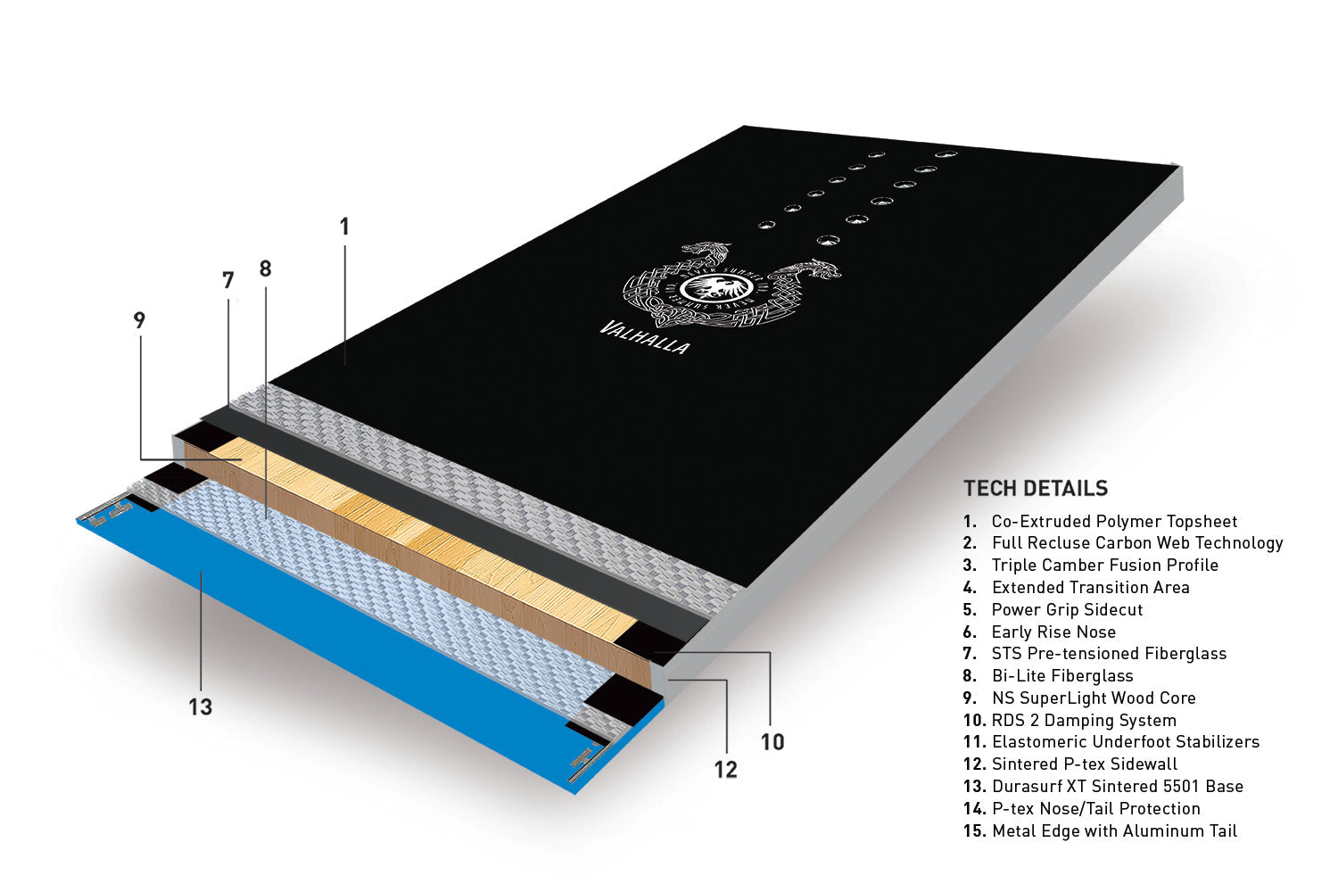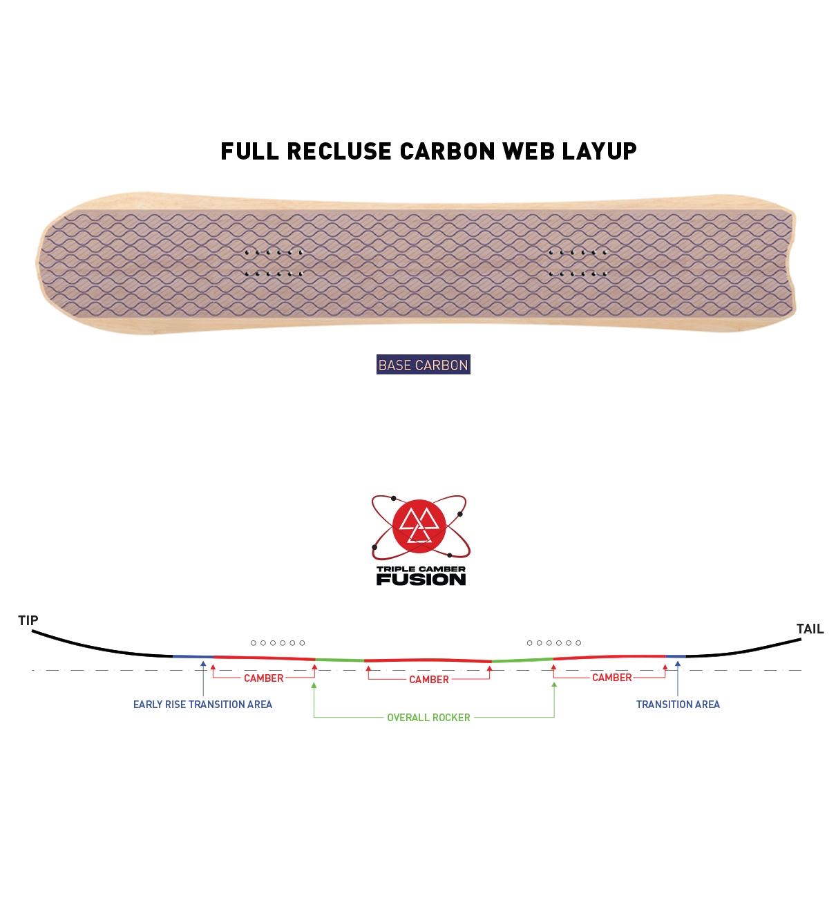 We’ve always been known for powerful freeride boards, and the Valhalla takes it to the next level. A firm flex combined with one of the most innovative profiles in snowboarding — the Triple Camber Fusion — allows this hard charging board to hold an edge even in the iciest conditions. A set-back stance, unique bat tail shape, tip to tail Recluse Carbon Web, and 7mm of taper keep the nose floating in deep powder and the tail powering through.